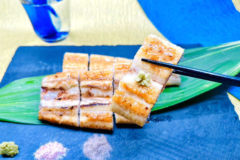 温めた白焼は、「塩・わさび・柚子胡椒・塩胡椒など」を付けると美味しさが引き立ちます。